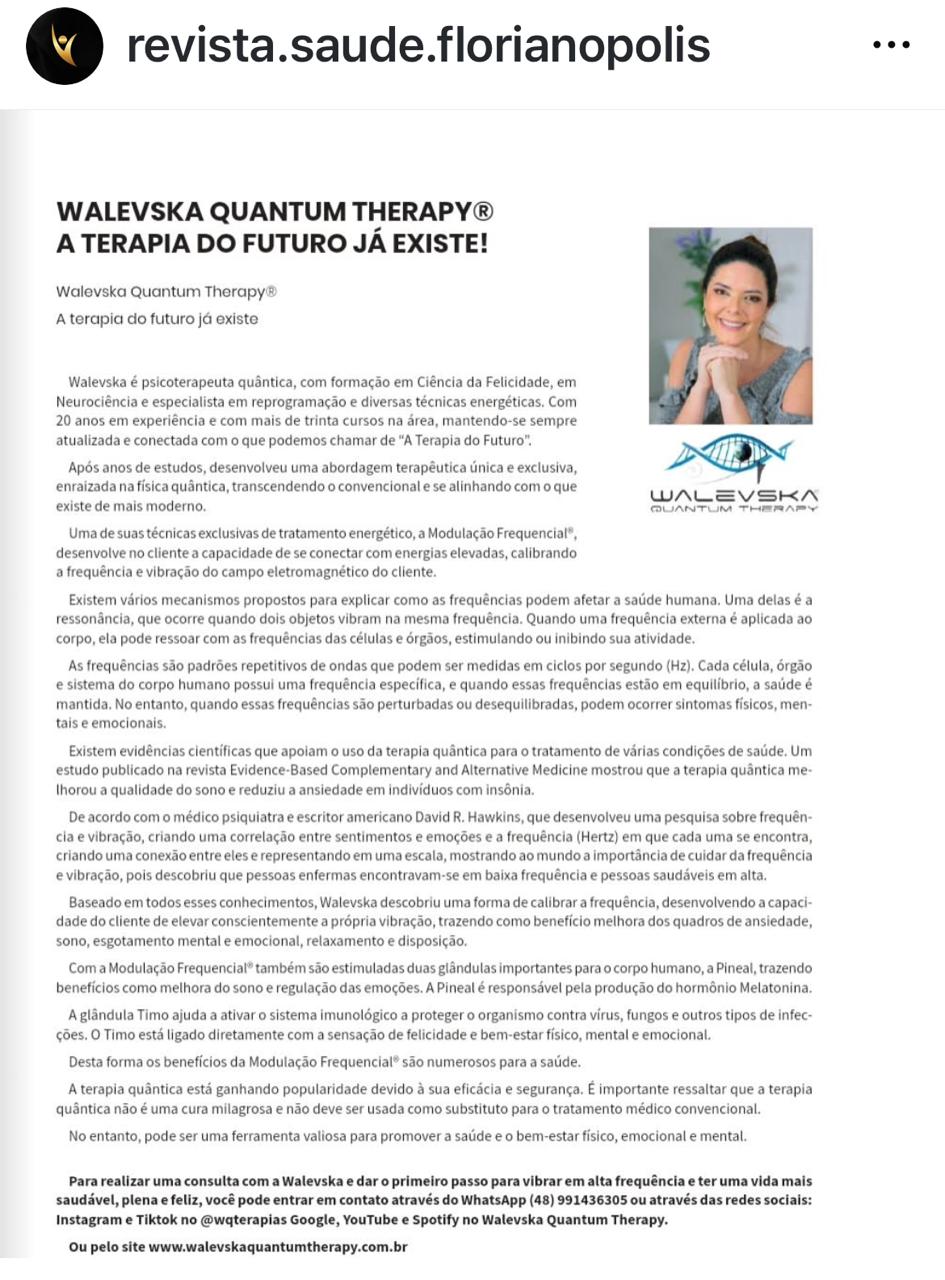 Walevska Quantum é psicoterapeuta e Cientista da Felicidade com especialização em neurociências, especialista em Modulação Frequencial®, reprogramação mental e diversas outras técnicas terapêuticas. Com mais de vinte anos de experiência, está sempre conectada ao que há de mais moderno na área da saúde mental.